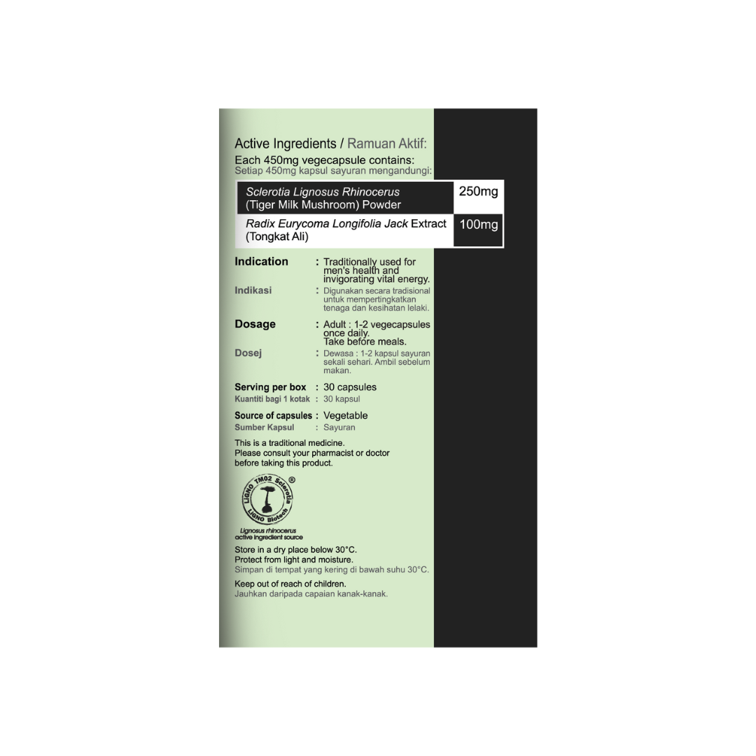 MAL12085049TC Nutriva® A-rimau contains two national treasures of Malaysia – Tongkat Ali extract and Tiger Milk Mushroom powder for improving men’s health and quality of life.