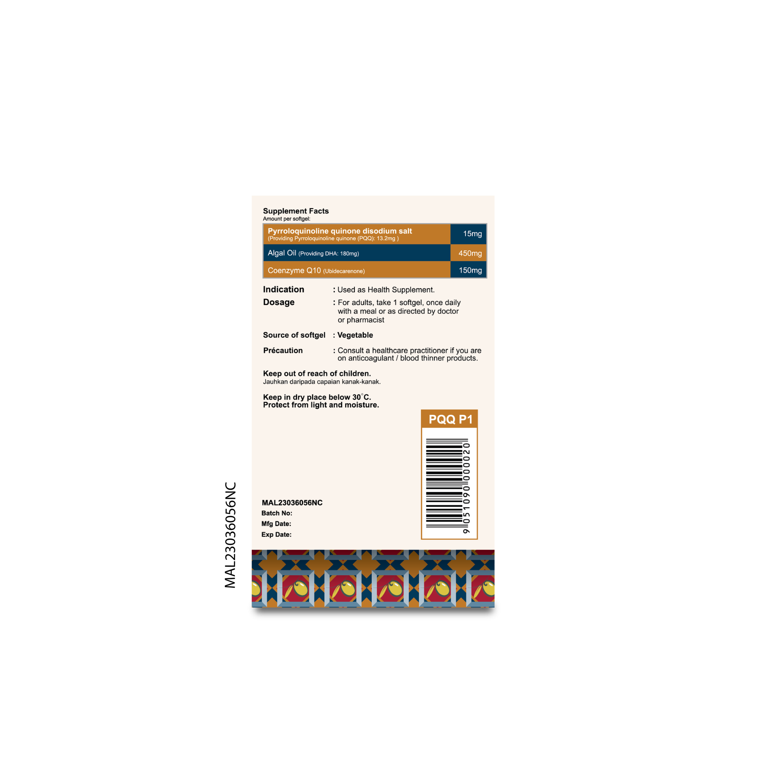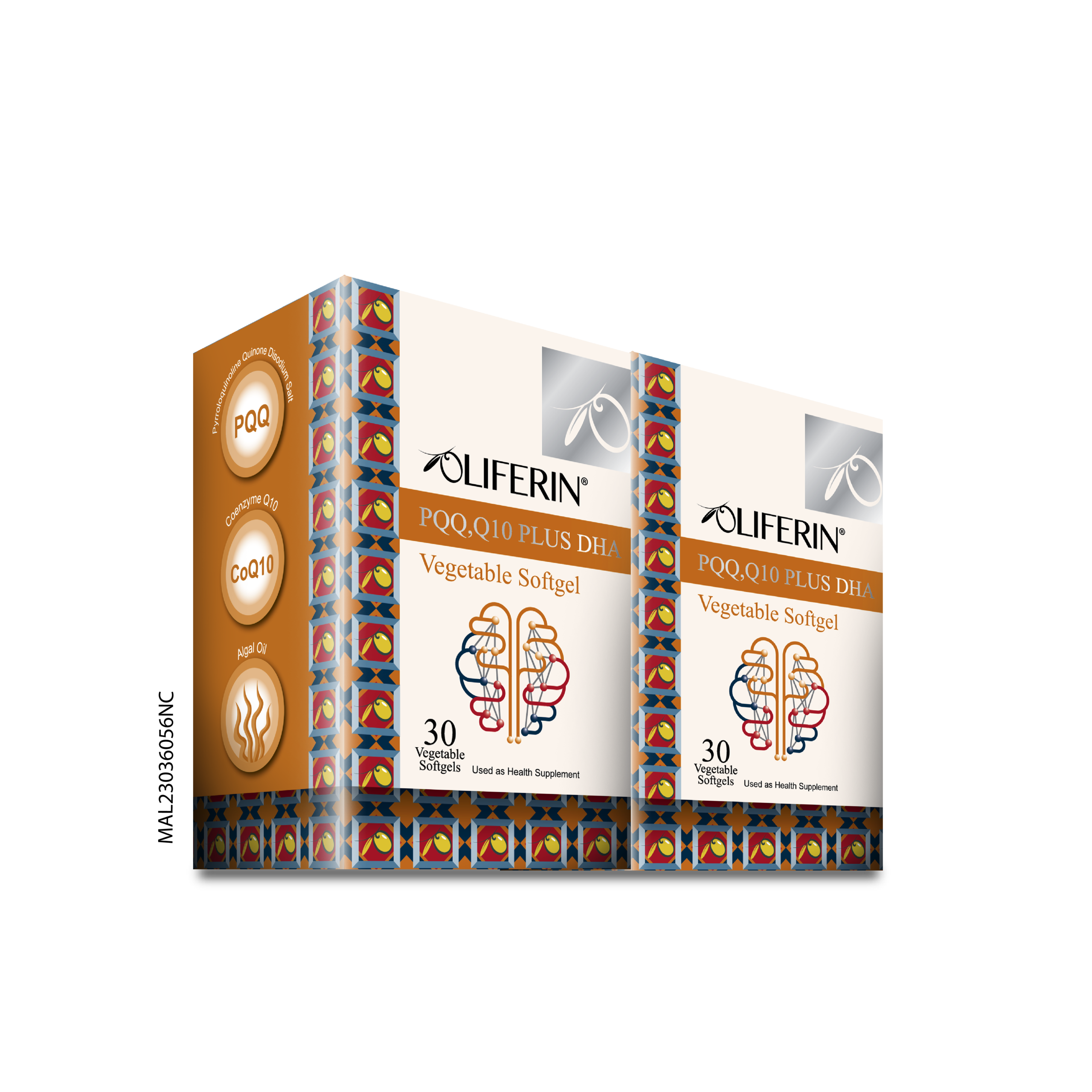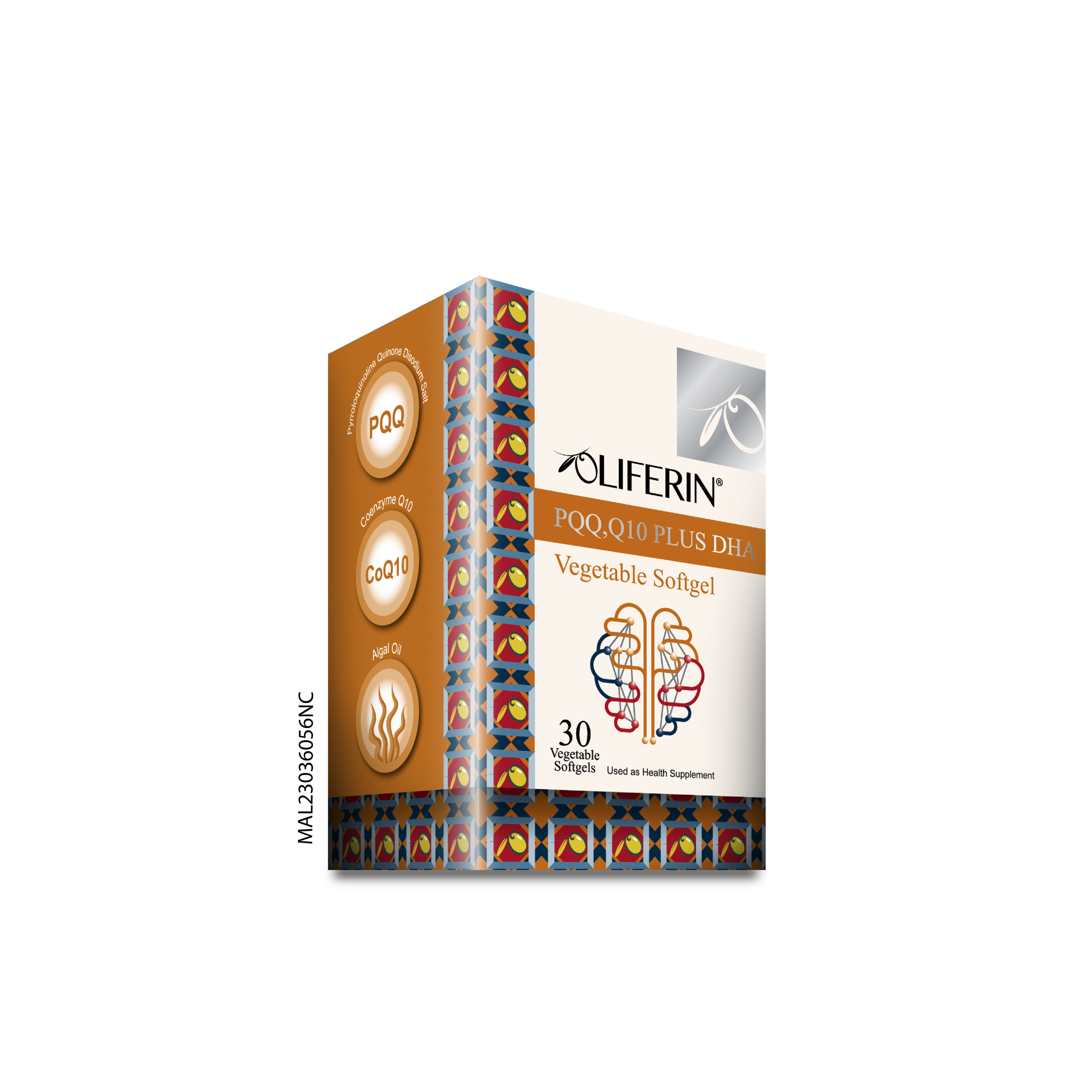 MAL23036056NC OLIFERIN® PQQ, Q10 PLUS DHA VEGETABLE SOFTGEL 30‘s  is an innovative formula features a synergistic combination of highly purified CoQ10 (from yeast), the only FDA affirmed GRAS PQQ (a purity level of over 99%) and vegan DHA (from algal oil) with olive oil as part of the delivery system for maximum absorption and health benefits.